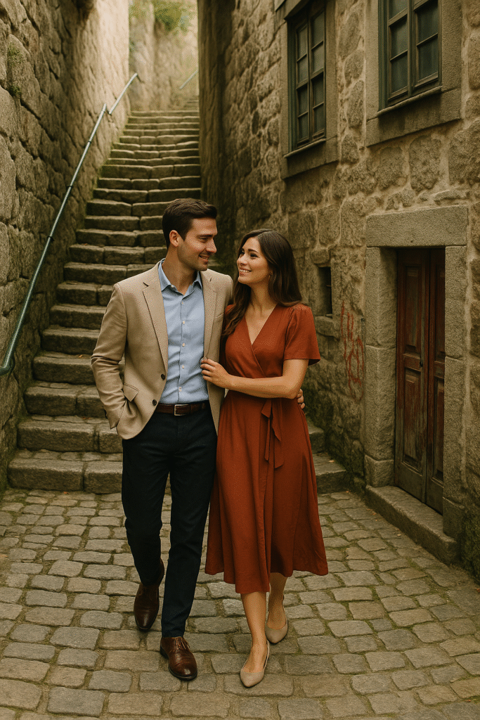 Nos lugares secretos do Porto com uma acompanhante, a fotografia ganha outra camada. Não é só sobre o fundo bonito, mas sobre a forma como os dois interagem com o espaço. Um toque suave na mão, um olhar trocado entre as escadas estreitas do Codeçal, uma gargalhada espontânea no meio do Jardim das Virtudes — isso sim, vale ser guardado.